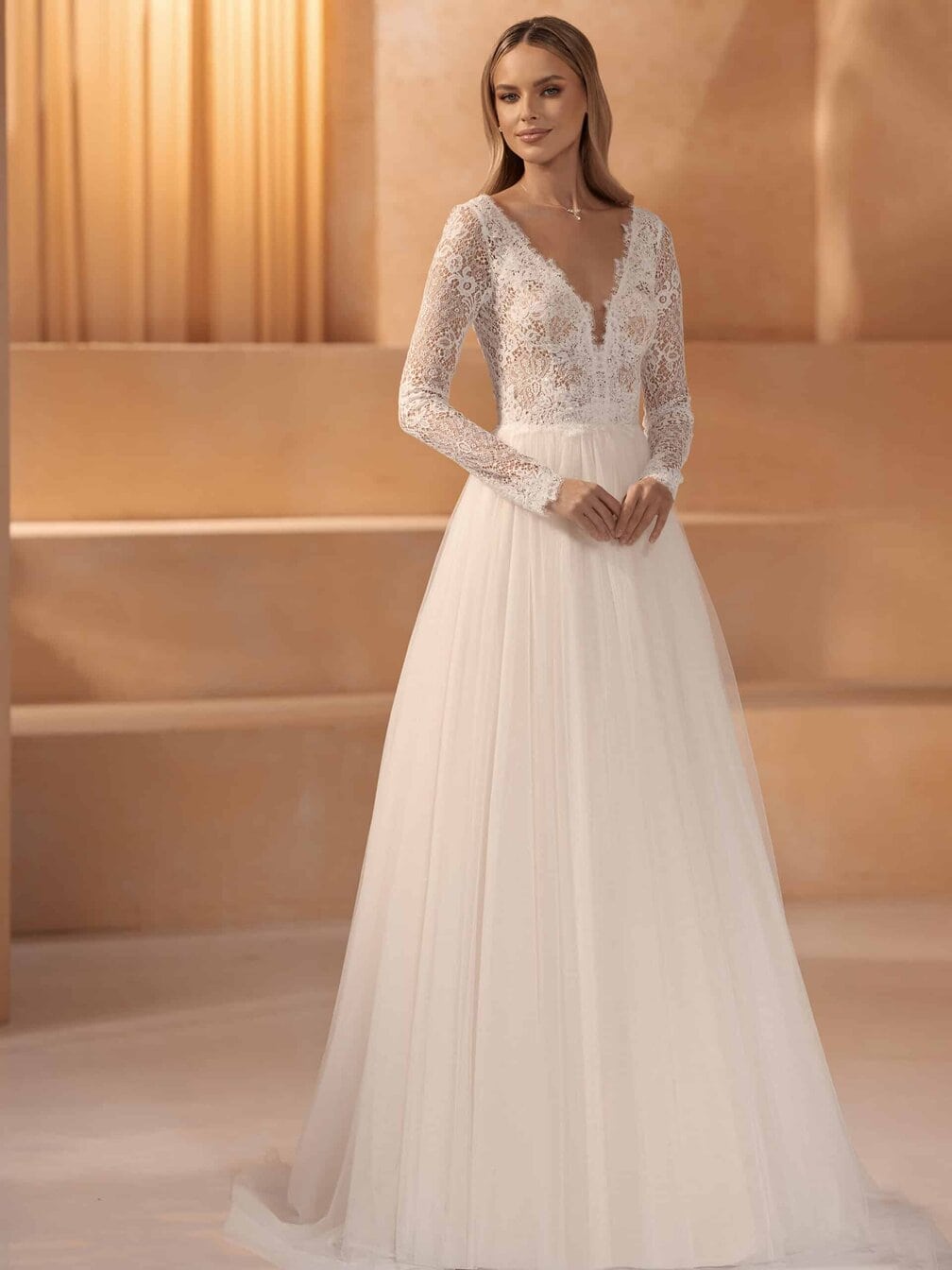 Das Brautkleid hat ein atemberaubenden Dekolleté. Erzeugt wir diese durch die verwendete Spitze im Oberteil des Brautkleides. Besonders apart wirkt der lange Spitzenarm. Das Brautkleid geht dann über in einen A-Linie fallenden Rock aus Soft Tüll mit Glitzer. Enden tut das Brautkleid in einer langen Schleppe.
